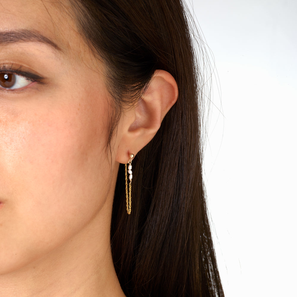 Introducing our earrings with shimmery chain and delicate rice freshwater pearls.